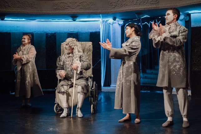 На малій сцені столичного Національного центру театрального мистецтва імені Леся Курбаса київський театр «Veritas» показав виставу «Емігранти» за п’єсою польського драматурга Славомира Мрожека. Постановку втілила режисерка Олександра Кравченко.​