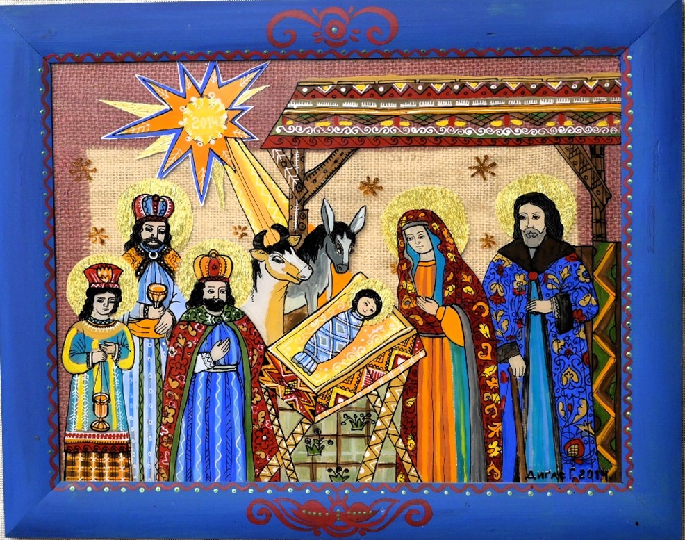 На одному з образів класичне Різдво подане з народною щирою безпосередністю: святкова врочистість, золоте тло, зоря над яслами – все дихає теплом і світлом. Це не застигла сцена, а жива подія, що відбувається тут і зараз.