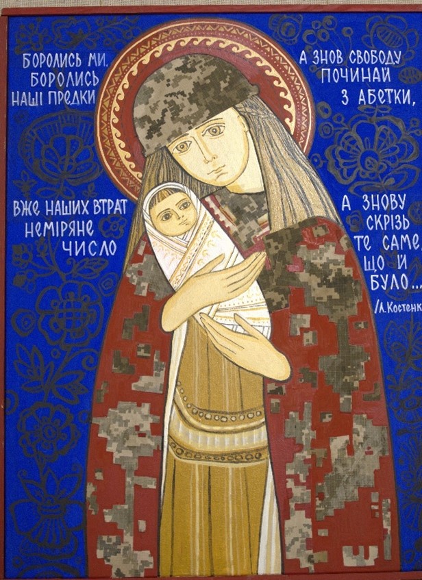 На іншому – солдатська мадонна: жінка у камуфляжі з німбом пригорає немовля, спеленене у біле з орнаментом. Символ країни, що бореться, народжує, і не втрачає людяності.