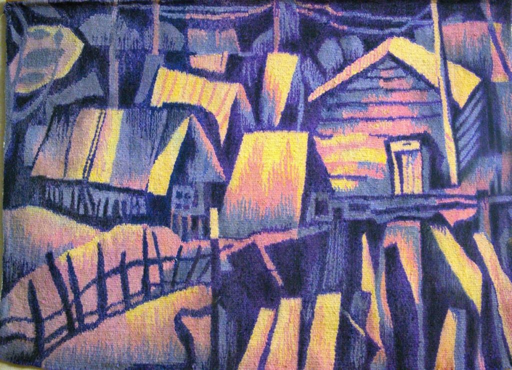 Ось гобелен – стилізований сільський пейзаж: геометрія хат, парканів, дерев творить ритм візуальної поезії. Фіолетові, сині, жовтаві тони звучать як драматичні акорди, між ними бузкова пастельна легкість, як тиша між словами. Гобелен дихає, рухається, неначе кадр, який повільно наближається.