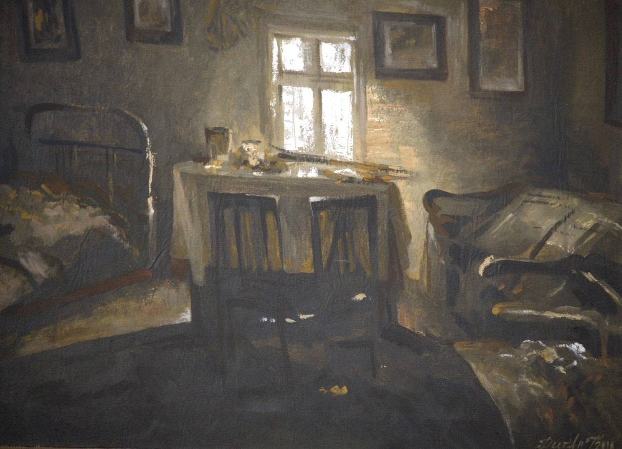 Інша робота – живописний нуар, інтер’єр з ліжком, столом, вікном. Світло падає з вікна, вирізаючи з темряви лише те, що має значення. Це кадр з талановито поставленим світлом. Як у фільмі, де кожна деталь – не випадкова. Тут немає людей, але є їхня присутність. Наче їдці картоплі щойно вийшли звідси, залишивши теплий слід у повітрі: зім’ята ковдра, трохи відсунутий стілець. Пляма світла на білому столі – мов репліка без слів. Це простір пам’яті, очікування, сподівання.