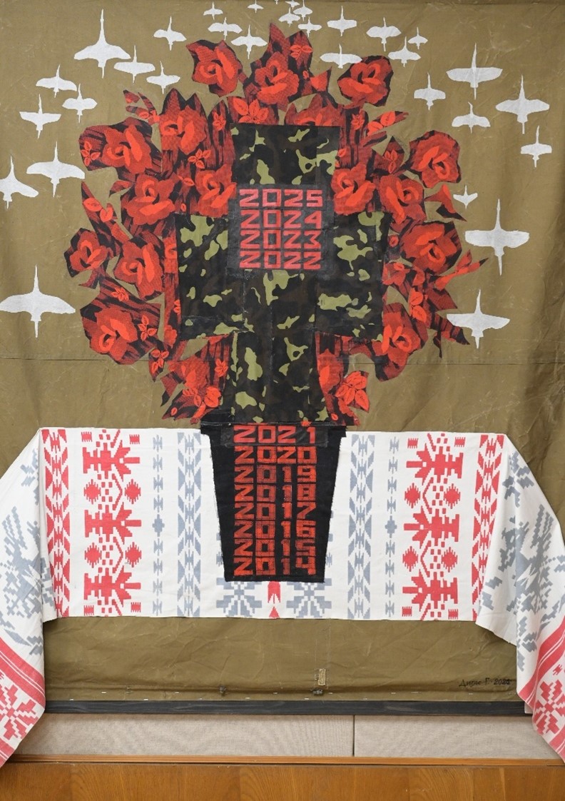 … У фіналі – текстильна інсталяція: традиційна вишивка зустрічається з камуфляжем. На тлі з плащ-палатки – дерево червоних маків: букет і спалах водночас. Символ крові, пам’яті, втрати. А над ним журавлі возносяться в небо. Їх не видно буквально, але відчуваєш рух, тінь, нескінченну вервечку душ. Трагічне літочислення: 2014… 2025… – лише чергова позначка. Невідомо, скільки ще воєнних літ і зим попереду, скільки імен буде вписано в цю габу пам’яті.