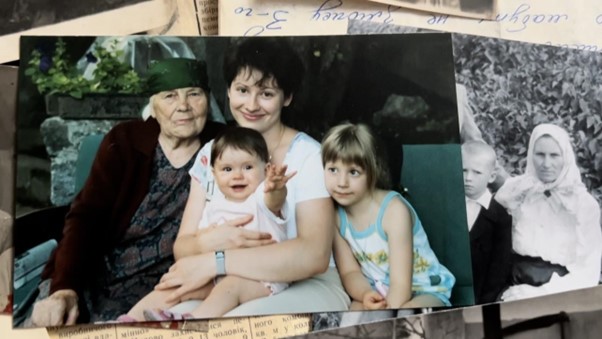 Моя прабабуся Надя, моя мама Лариса, маленька я та моя двоюрідна сестра Катя; 2006 р.