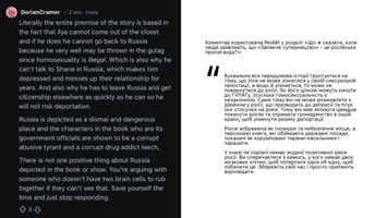 І навіть попри те що книжка вийшла до повномасштабного російського вторгнення в Україну, її екранізація сьогодні є етично сумнівною. Чи випадково російська мова звучить в кадрі як важливий елемент близькості між героями? Так, серіал фактично романтизує мову агресора. Наприклад, Шейн просить Іллю навчити його російської. А в одній зі сцен після інтимної близькості наполягає повторити російською зізнання у коханні. Ну чим не привід для того ж таки американського кіноглядача душевно зріднитися із росіянином? У соцмережах американці щиро дивуються закликам українців бойкотувати фільм, бо як, мовляв не відчути страждання кіношного Іллі Розанова, який потерпає від гомофобії у власній країні? Саме в цьому і криється проблема підміни понять: те, що подається у романтичному контексті, фактично змінює оптику сприйняття. Глядач зворушено споглядає за «забороненим коханням», проте геть не зважає на те, що країна-агресор починає асоціюватися з довірою і пристрастю, котрі протистоять «похмурим гомофобним реаліям», а не масовим убивствам, ґвалтуванням російськими нелюдами на окупованих територіях України жінок, дівчат, підлітків обох статей і навіть малих дітей.