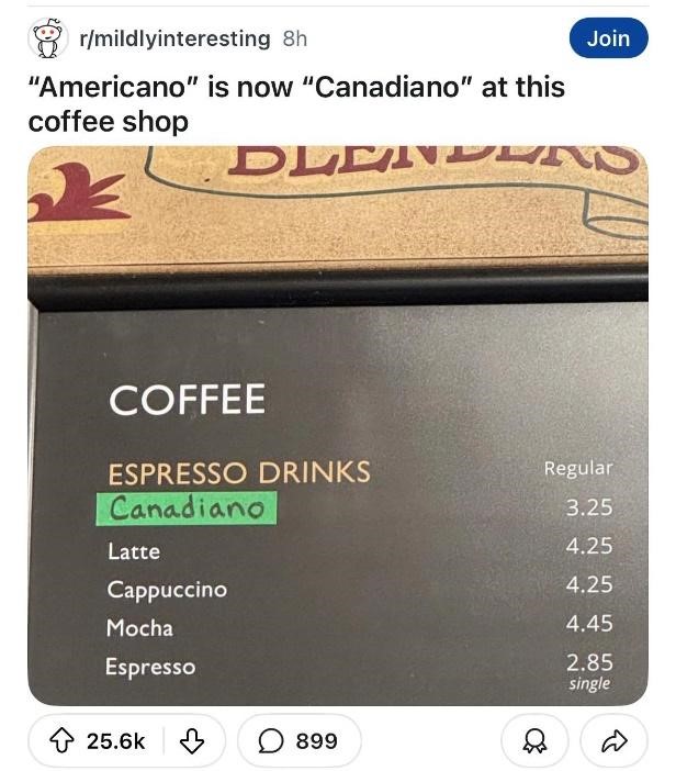 Не залишився осторонь і канадський бізнес. До прикладу, тамтешні кафе, бари й ресторани виключають американські продукти. А відразу після набуття чинності запропонованих Трампом мит в інтернет-спільноті піднялася хвиля перейменувань кавового напою «Американо» на «Канадіано».