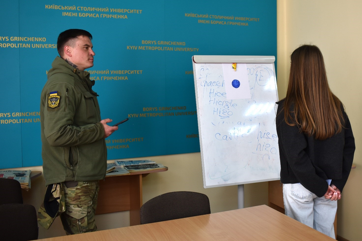 Гості продемонстрували кілька практичних вправ, які використовують для підготовки бійців. Студенти змогли випробувати себе у двох із них. Перша полягала в тому, щоб протягом хвилини, не моргнувши, дивитися на одну точку: так тренують концентрацію та контроль над емоціями. Друга передбачала роботу в парі: учасник стояв упритул позаду іншого і пильно вдивлявся йому в потилицю. Це відчуття «погляду» допомагає розвивати уважність і психологічну стійкість. Олександр Дідур розповів: французькі військові спецпризначенці тренують і в такий спосіб справжній пронизливий погляд, якому вкрай важко не піддатися.