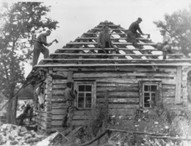 А побіля хати – клунька. З віялкою, човном-довбанкою, плугом, вершами, снопами збіжжя, в’язанками тютюну. І з дерев’яний возом. Це простір праці. Реманент не німує: мимоволі чуєш, як поскрипують колеса у воза, як шелестить колосся у снопах…