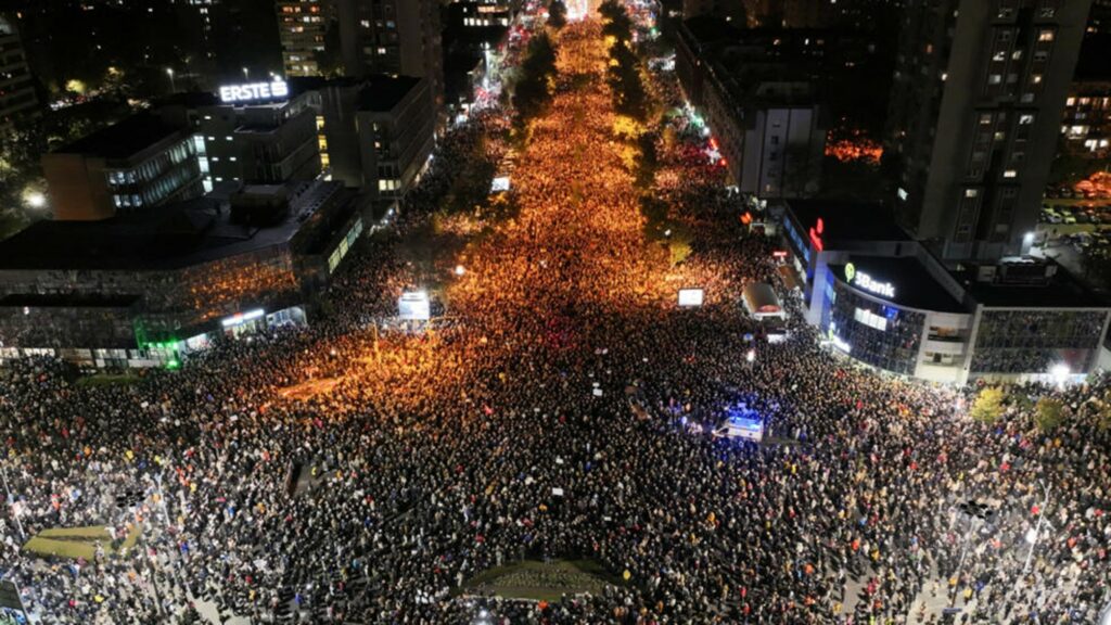 На демонстрацію в Бєлгараді, очолювану керівником опозиційного руху «Сербія» Здравком Поношем, зібралося до мільйона учасників. Для невеликої країни це небувалий сплеск масового невдоволення. Люди обурені неефективністю адміністрації президента Александра Вучича. Такі масштаби протесту вже ставлять під сумнів стабільність нинішньої влади і можуть призвести до суттєвих політичних змін. Вучич заявив, що готовий перевірити свою легітимність на виборах через «чотири-п’ять місяців, а може, і через три». Він також підтримав мирний підхід правоохоронних органів до дій мітингарів. Хоча демонстранти стверджують, що правоохоронці використали «звукові гармати», спричинивши серед протестувальників масову паніку. Втім, влада країни це рішуче заперечила.