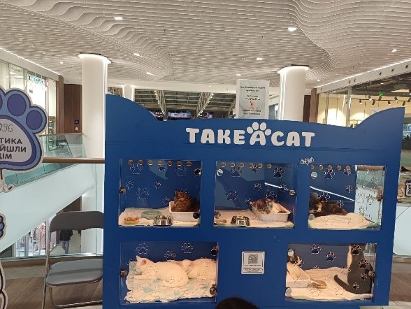 Вихідними у торгово-розважальному центрі столичного Лівобережжя «River Mall» особливо гамірно. Покупці з пакетами, цілі родинні гурти, дзвінкоголоса дітлашня… І за цим людським потоком невимушено спостерігають котики. Вони у спеціальних боксах прибули сюди з волонерами фонду «Take a cat».