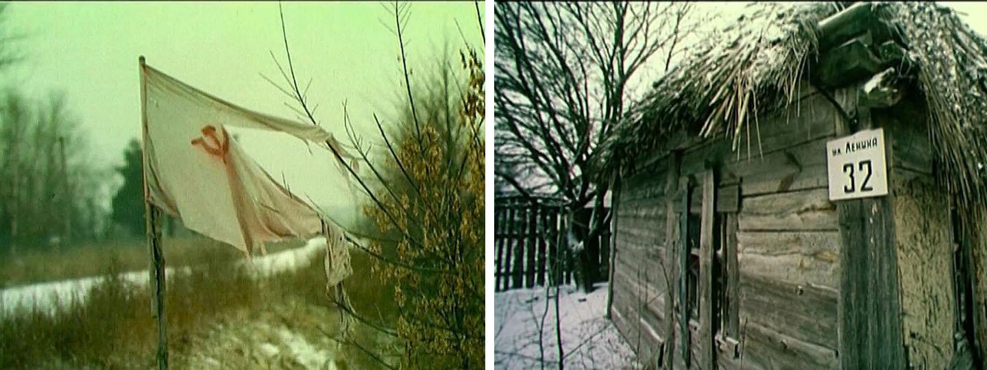 Інший образ – вказівник села Луб’янка у Чорнобильській зоні, далі крізь морозяний морок проступає примара чорнобильського саркофага. Засніжені вулиці покинутого українського села, де на будинках із забитими дошками вікнами ще висять таблички «вулиця Леніна». Це кадри, що волають: імперія залишає по собі пустку й руїну.